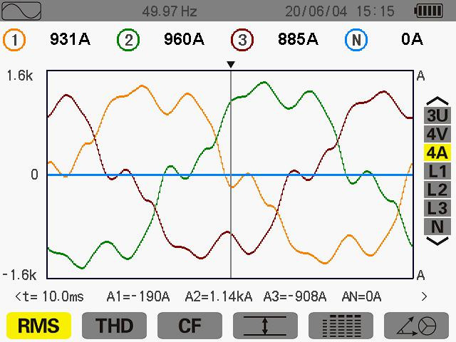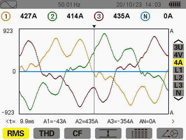 此次測量在其 ABC 電流分別為 427A 414A 435A 當(dāng)天生產(chǎn)使用其變壓器為60%,未滿負(fù)載運行中。